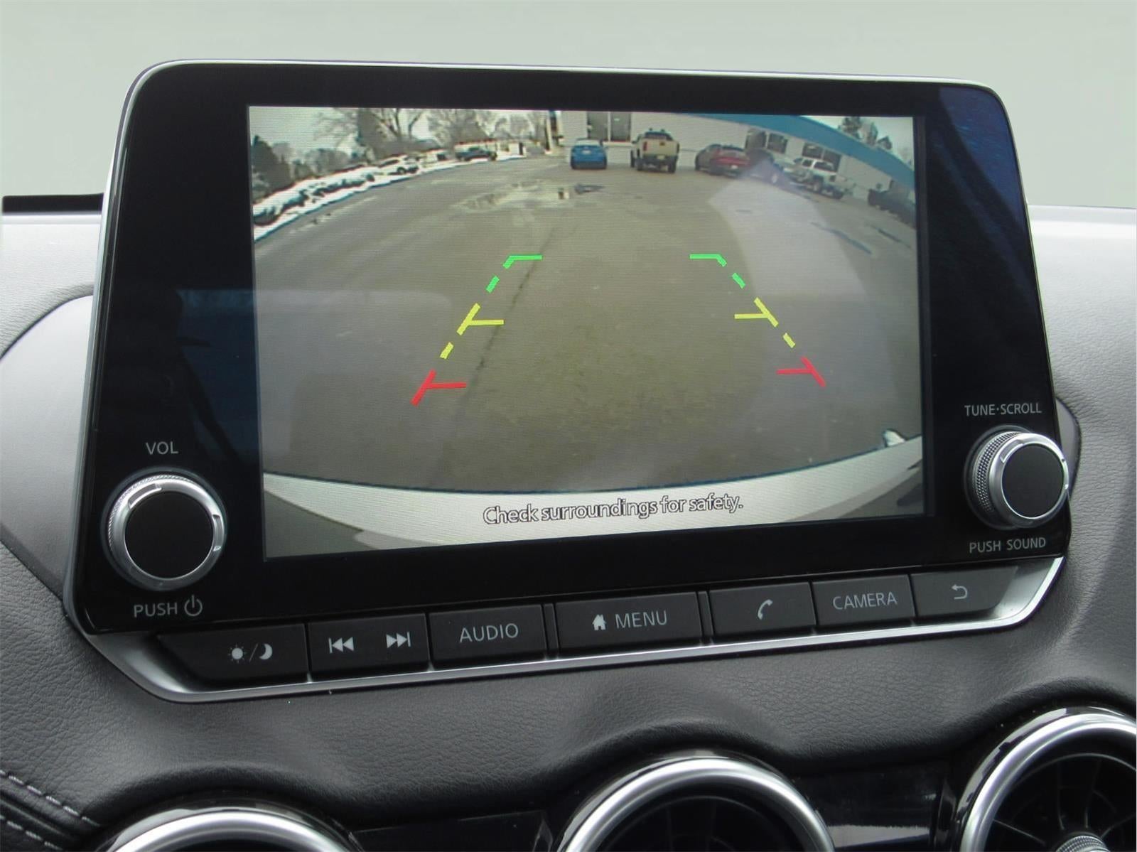 - The vehicle is equipped with a camera that displays an image of the area behind the vehicle on an interior display.